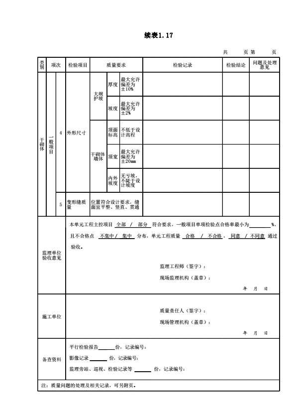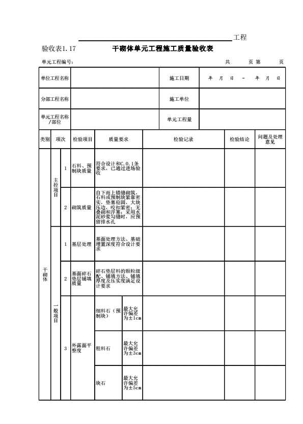 表格名称:表1.17 干砌体单元工程施工质量验收表