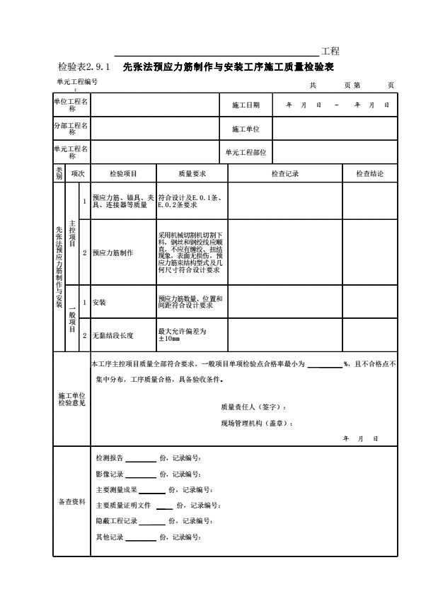 表格名称:表2.9.1 先张法预应力筋制作与安装工序施工质量检验表