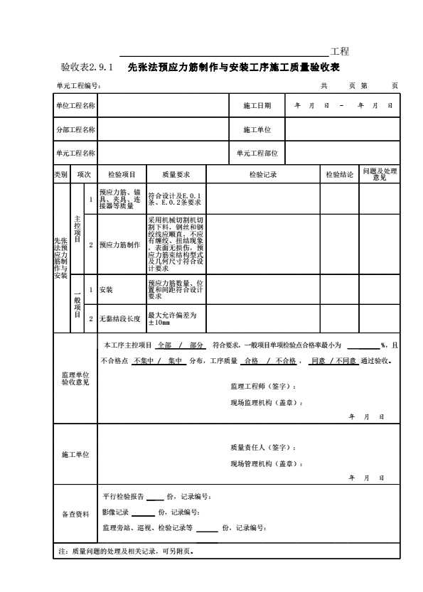 表格名称:表2.9.1 先张法预应力筋制作与安装工序施工质量验收表