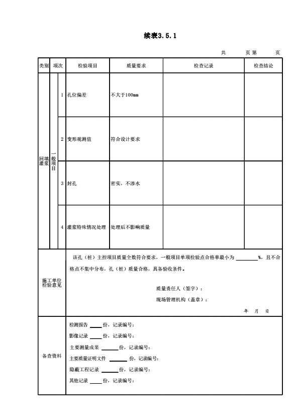 表3.5.1 回填灌浆单孔施工质量检验表