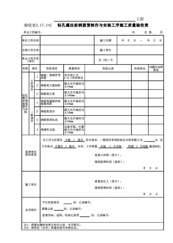表格名称:表3.17.1-2 钻孔灌注桩钢筋笼制作与安装工序施工质量验收表