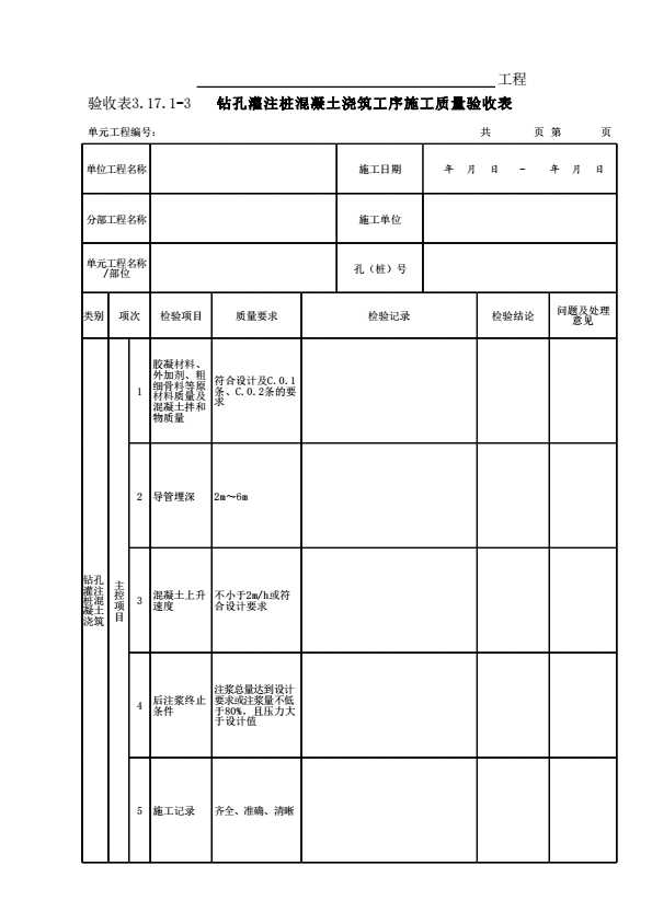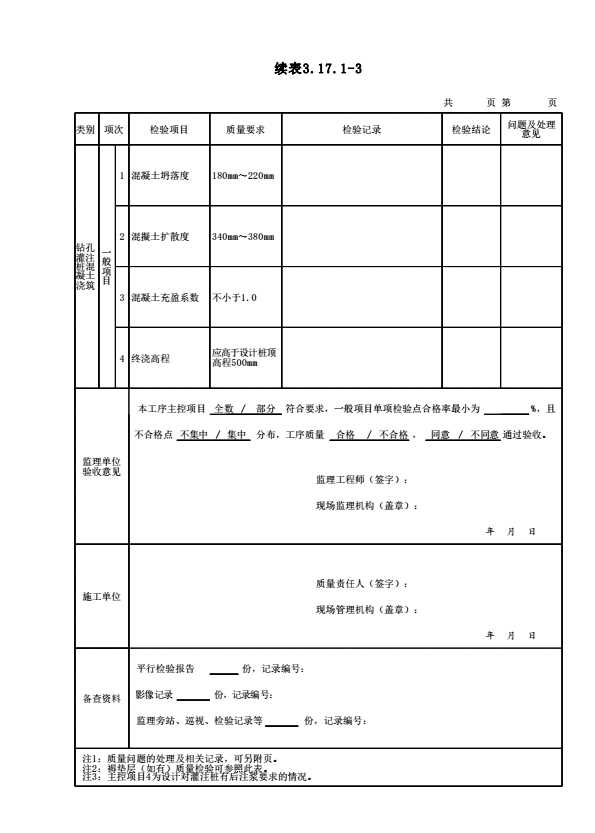 表格名称:表3.17.1-3 钻孔灌注桩混凝土浇筑工序施工质量验收表