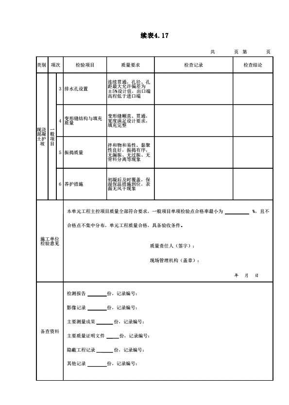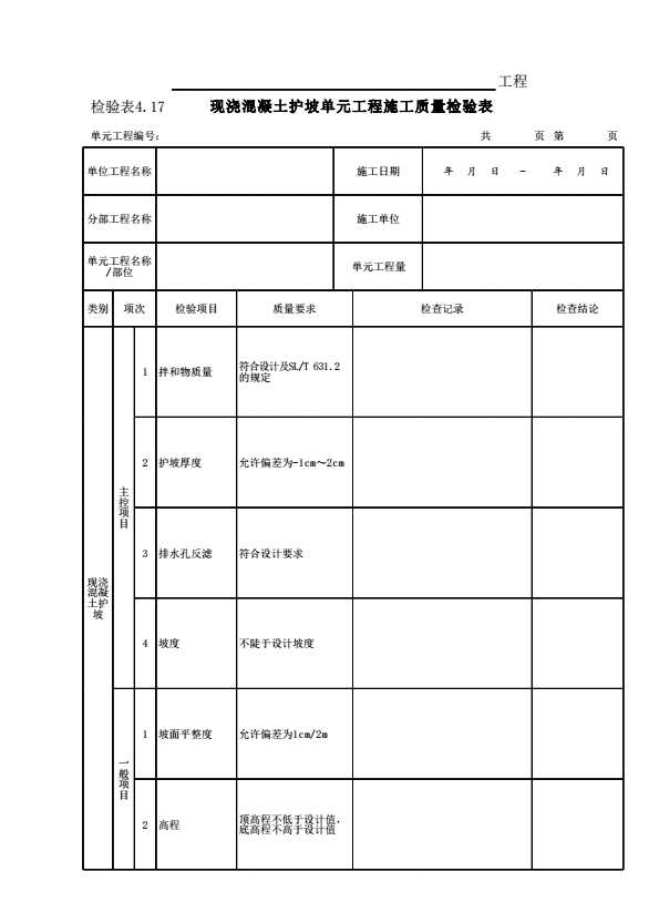 表格名称:表4.17 现浇混凝土护坡单元工程施工质量检验表