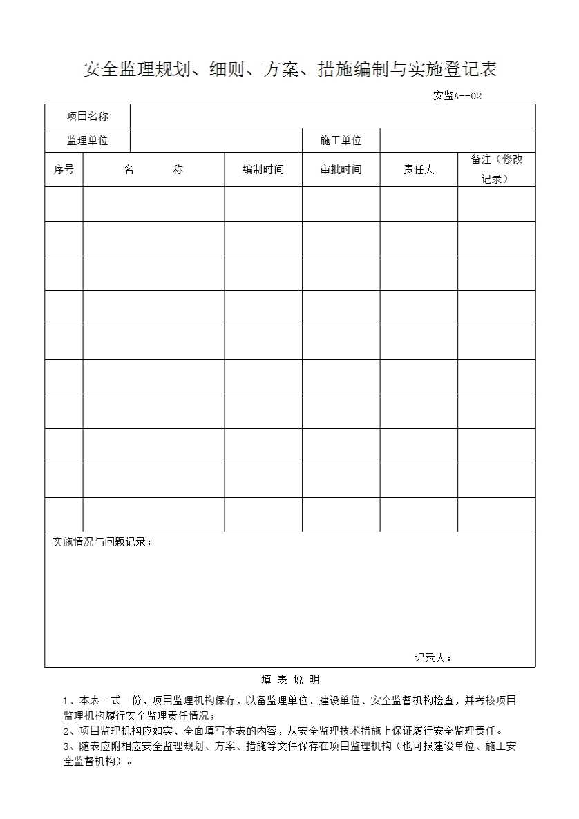 安全监理规划、细则、方案、措施编制与实施登记表(安监A-02)