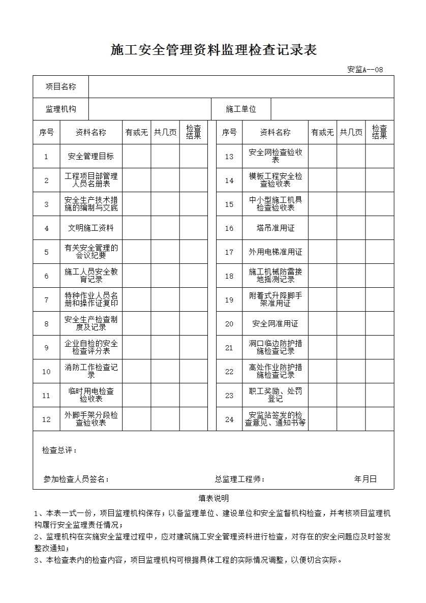 表格名称:施工安全管理资料监理检查记录表(安监A-08)
