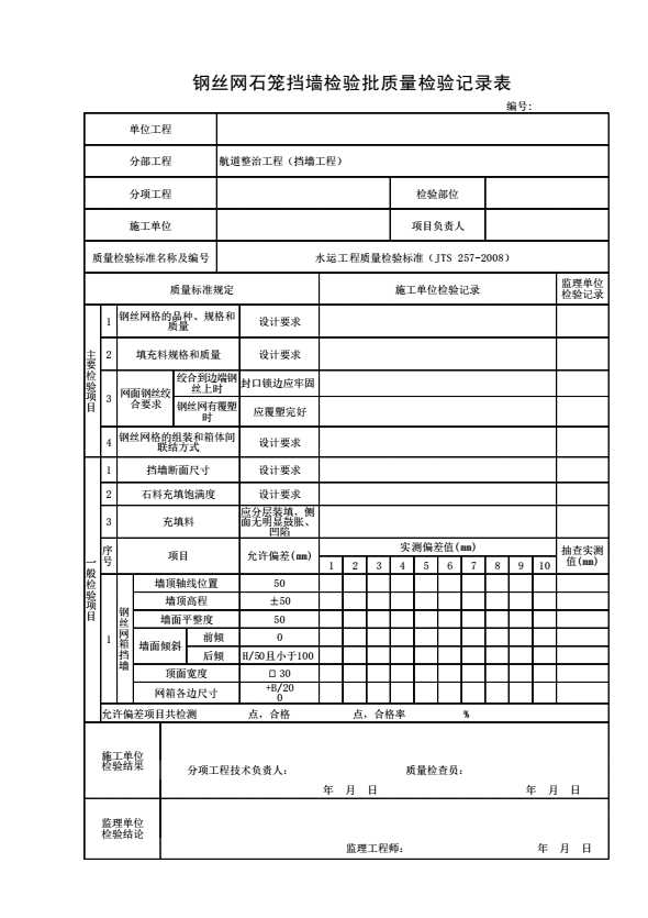 表格名称:钢丝网石笼挡墙检验批质量检验记录表(修订)