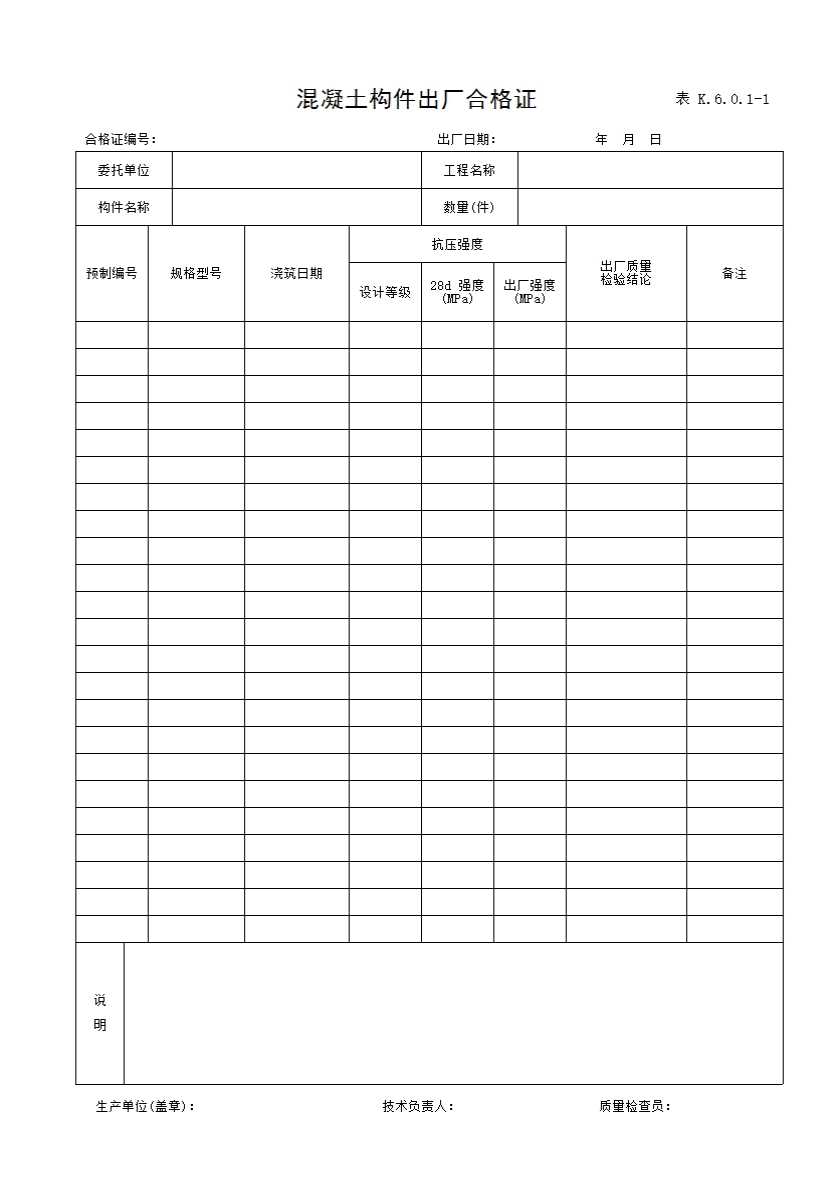 表格名称:表K.6.0.1-1 混凝土构件出厂合格证