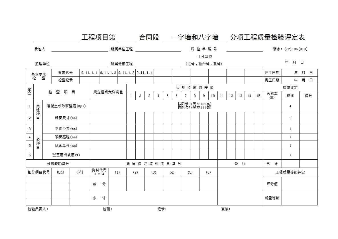 表格名称:116 一字墙和八字墙分项工程质量检验评定表