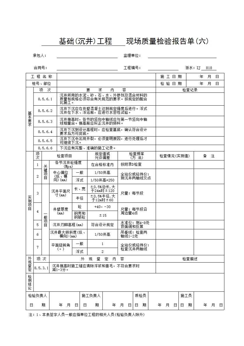 表格名称:浙水:ZJ818 基础(沉井)工程现场质量检验报告单(六)