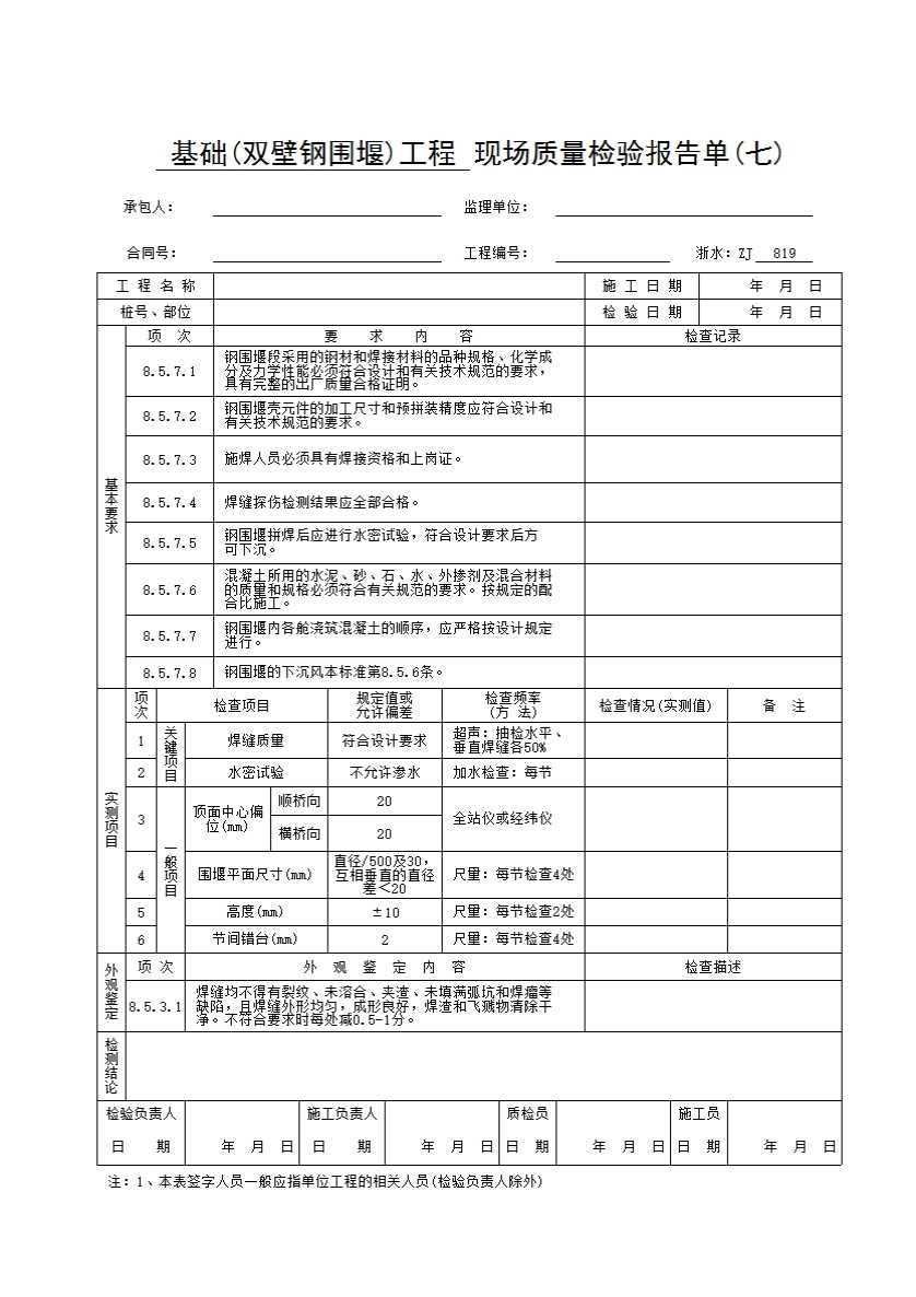 表格名称:浙水:ZJ819 基础(双壁钢围堰)工程现场质量检验报告单(七)