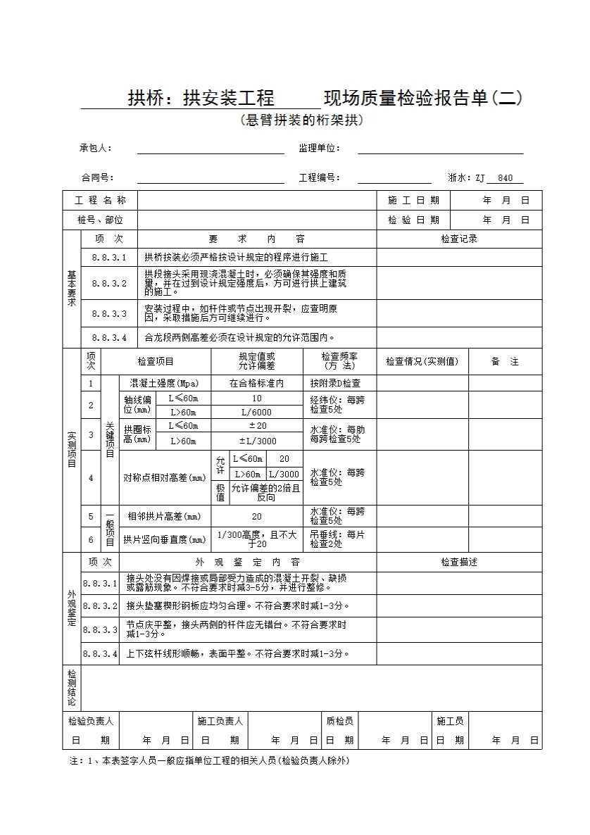 表格名称:浙水:ZJ840 拱桥:拱安装工程现场质量检验报告单(二)