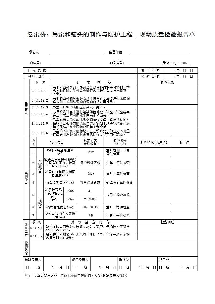 表格名称:浙水:ZJ886 悬索桥:吊索和锚头的制作与防护工程现场质量检验报告单