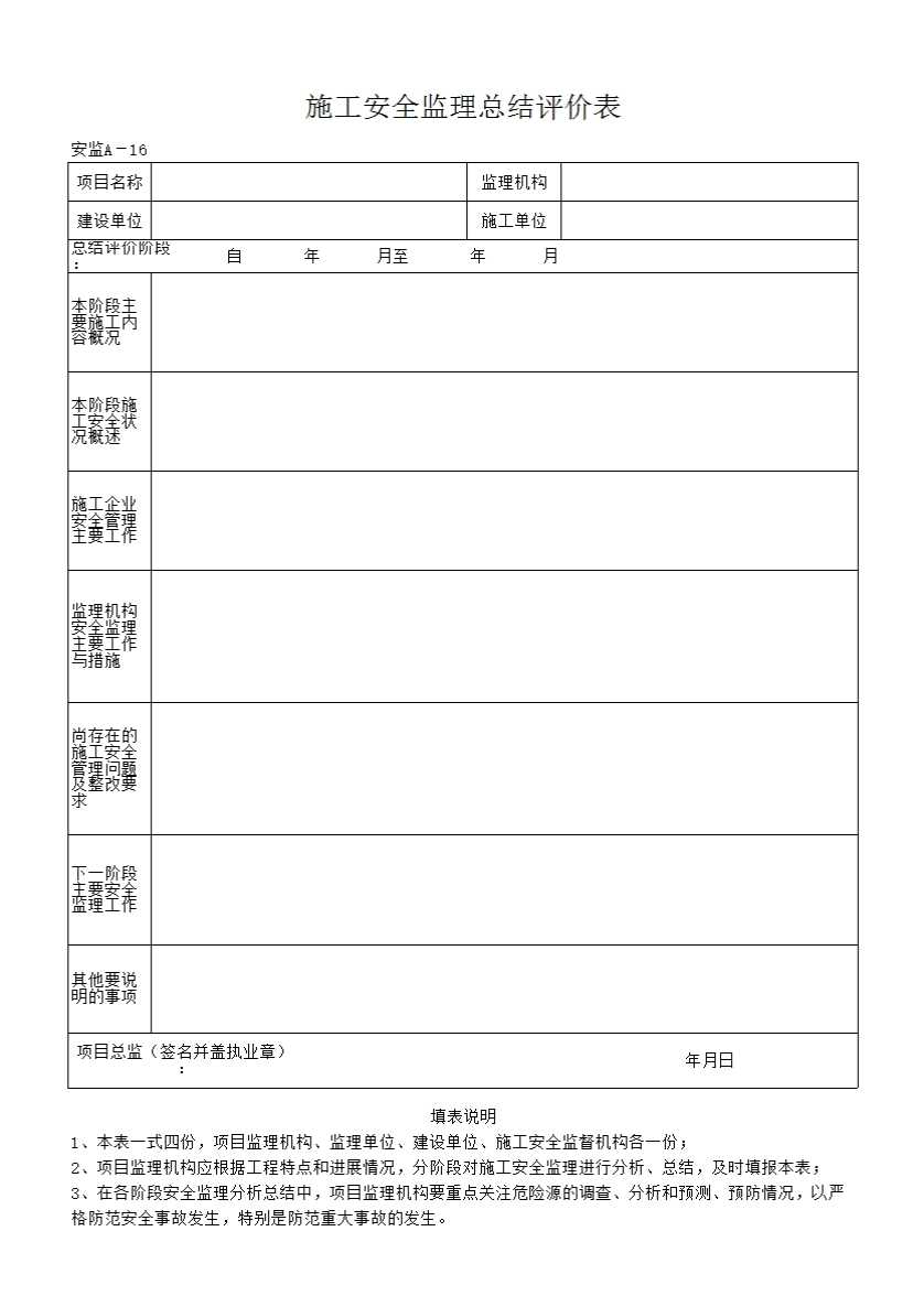 表格名称:施工安全监理总结评价表(安监A-16)