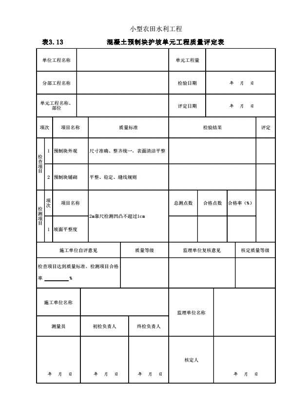 表格名称:表3.13 混凝土预制块护坡单元工程质量评定表