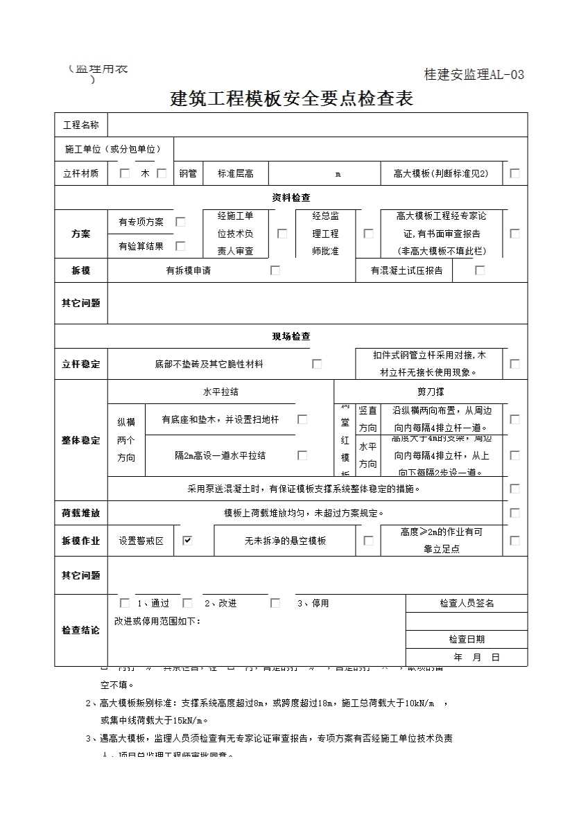表格名称:建筑工程模板安全要点检查表 AL-03