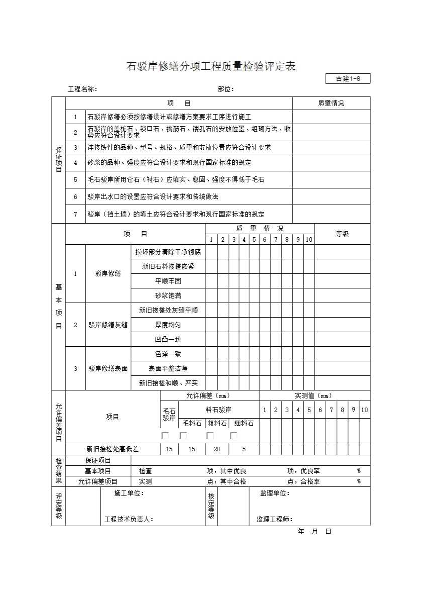 表格名称:石驳岸修缮分项工程质量检验评定表