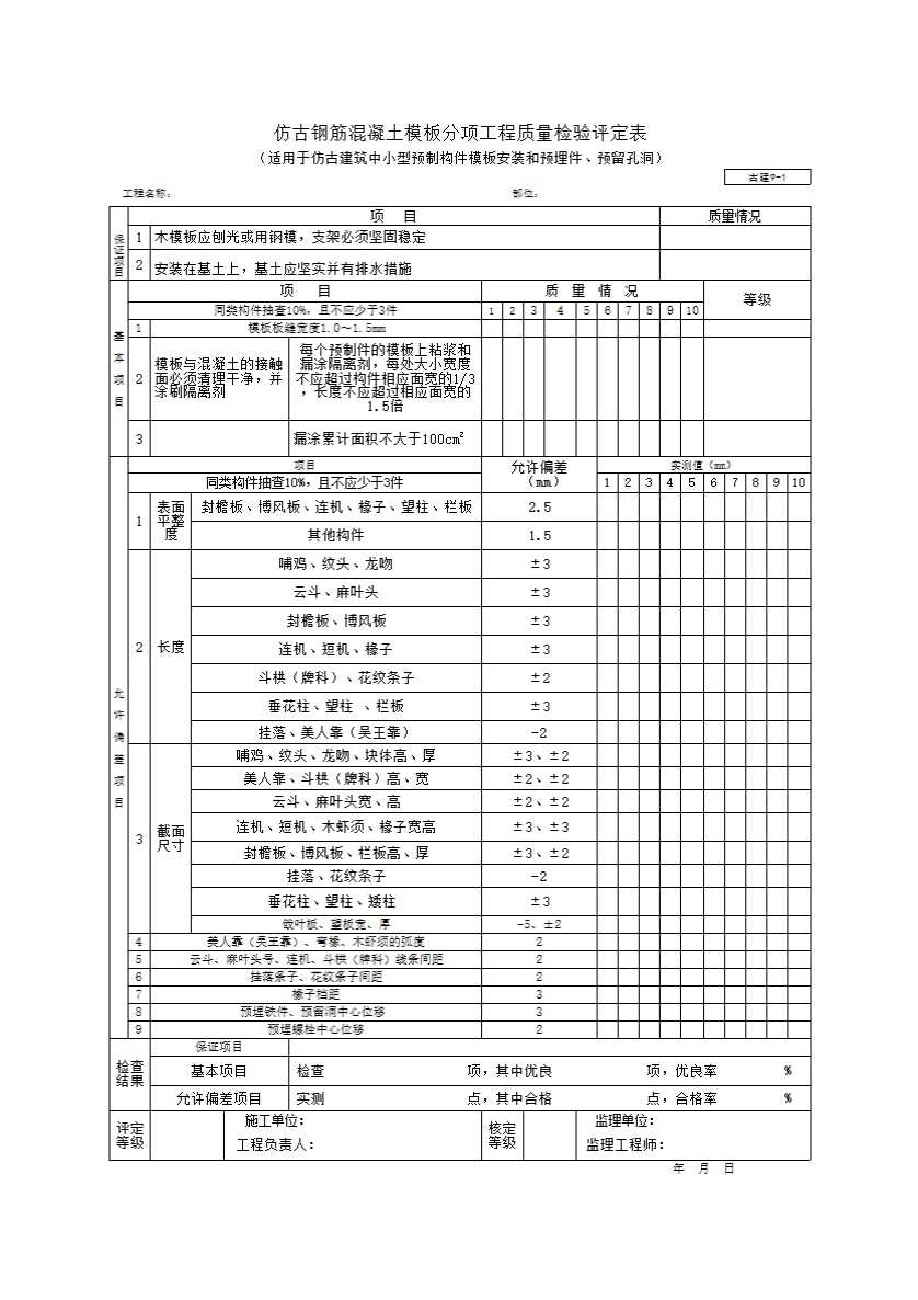 仿古钢筋混凝土模板分项工程质量检验评定表