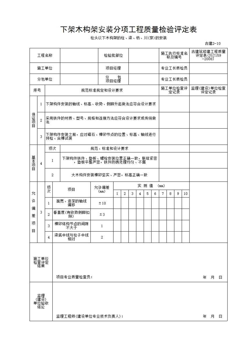古建2-10 下架木构架安装分项工程质量检验评定表