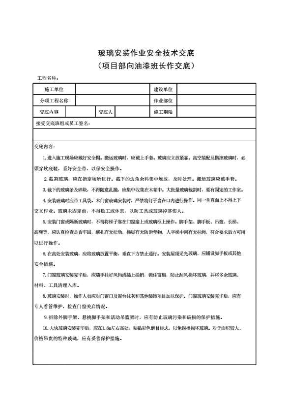 表格名称:玻璃安装作业安全技术交底(项目部向油漆班长作交底)