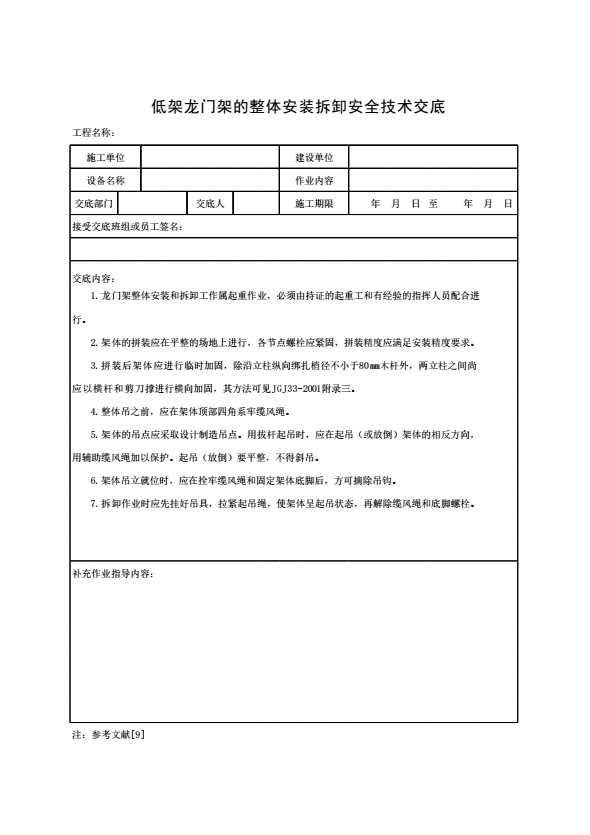 表格名称:低架龙门架的整体安装拆卸安全技术交底