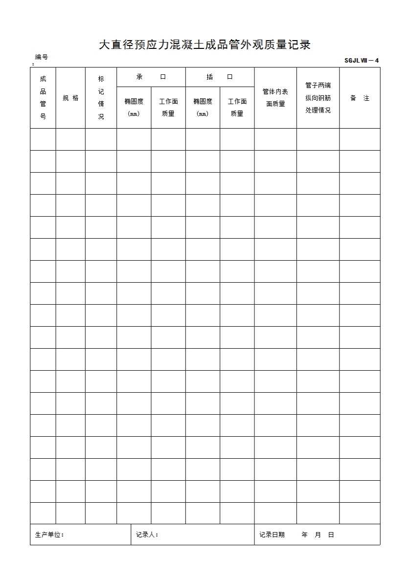 表格名称:大直径预应力混凝土成品管外观质量记录