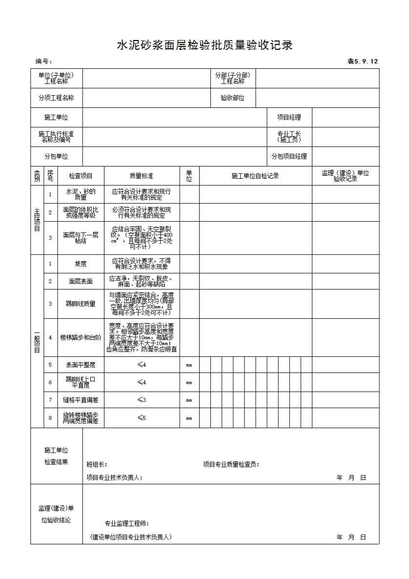 表格名称:5.9.12 水泥砂浆面层检验批质量验收记录