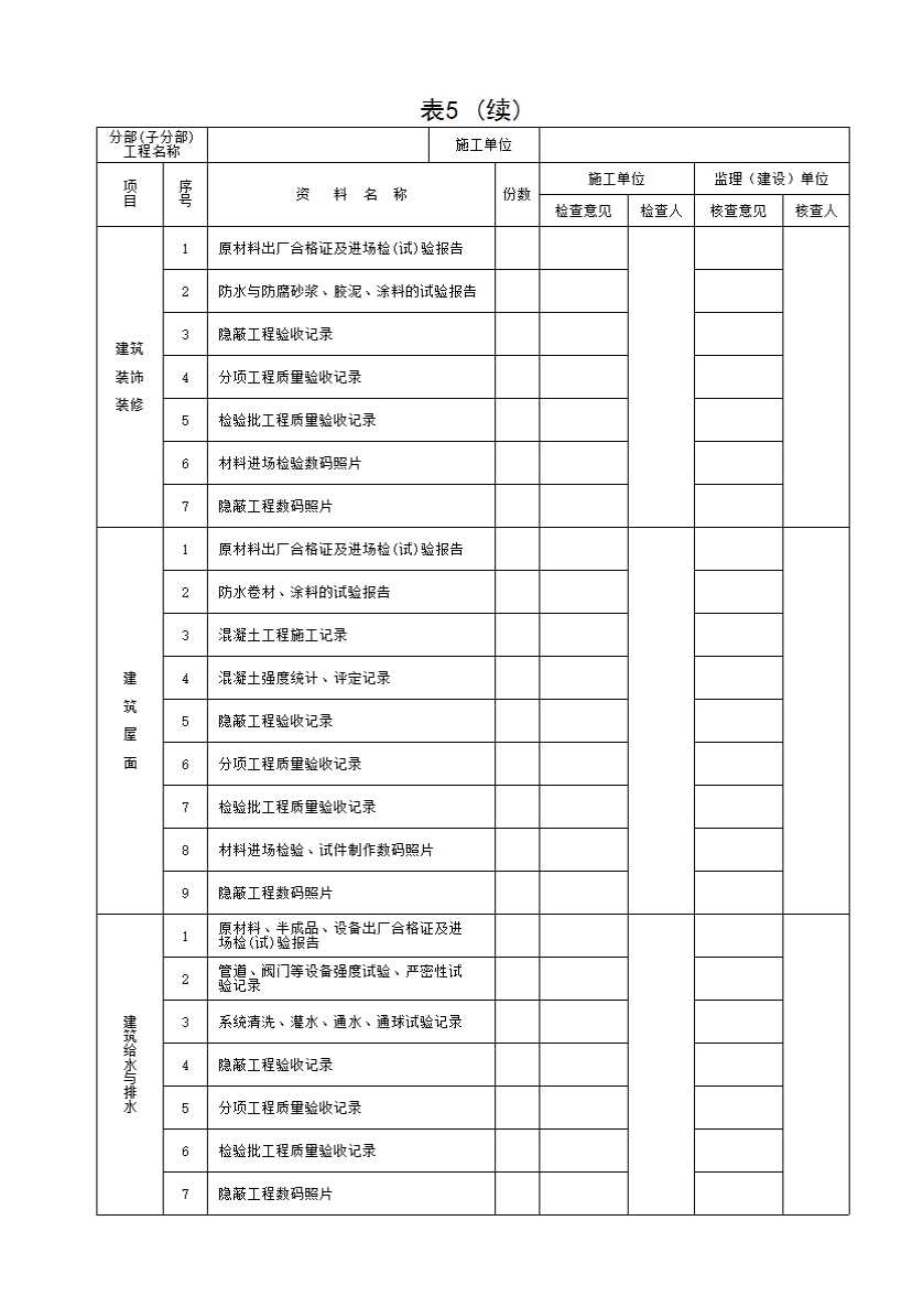 表格名称:表5 分部(子分部)工程质量控制资料核查记录