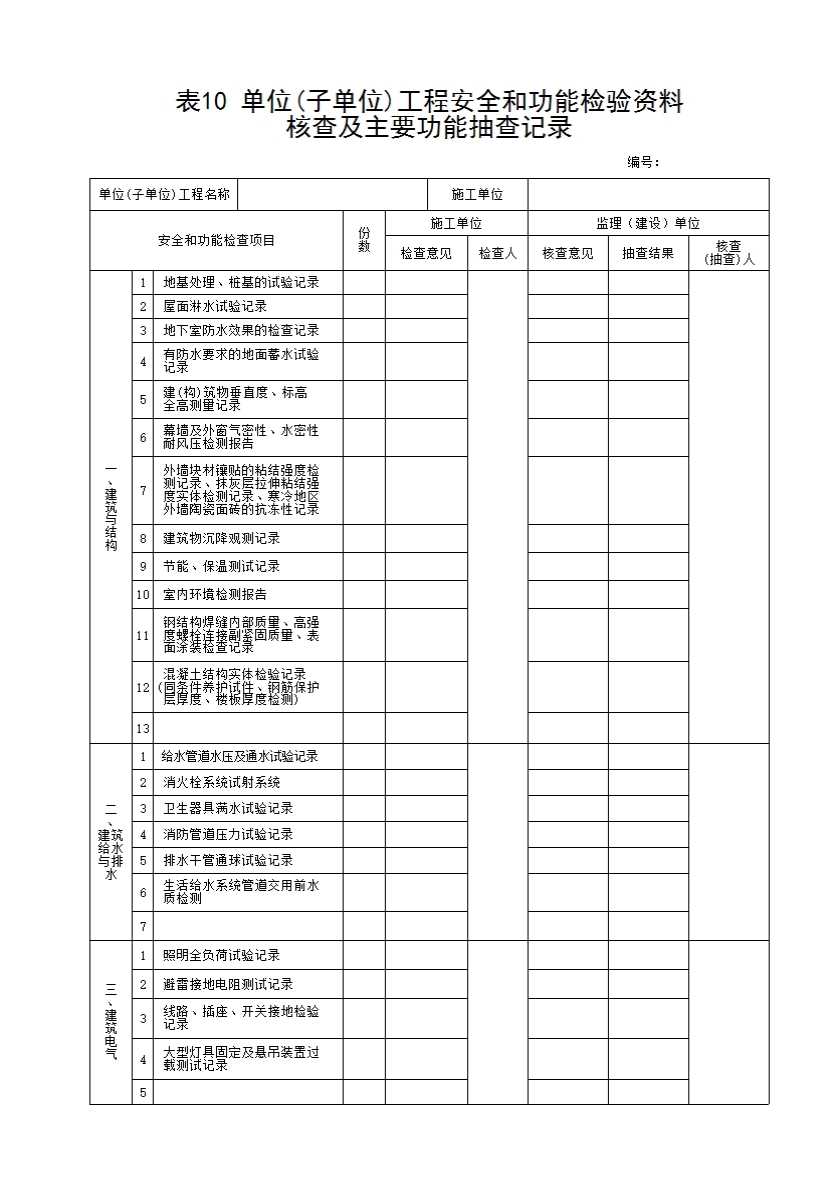表格名称:表10 单位(子单位)工程安全和功能检验资料核查及主要功能抽查记录