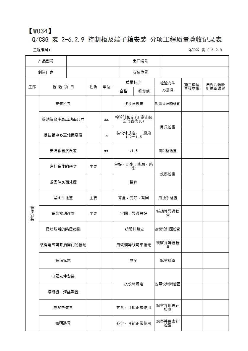 QCSG 表 2-6.2.9 控制柜及端子箱安装 分项工程质量验收记录表