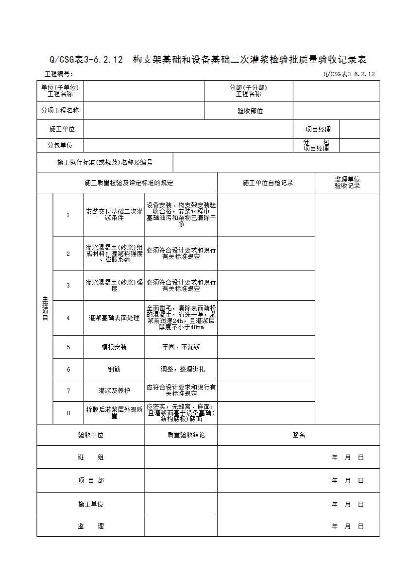 QCSG 表 3-6.2.12 构支架基础和设备基础二次灌浆检验批质量验收记录表