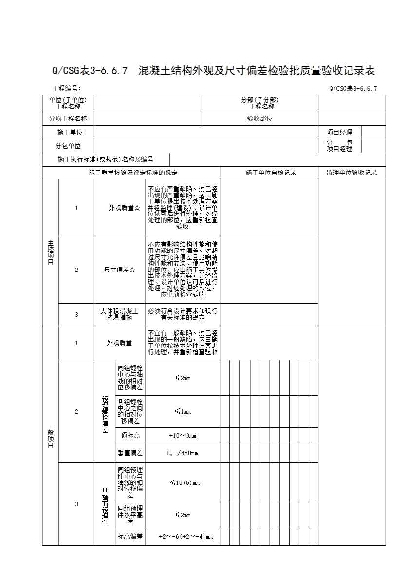 QCSG 表 3-6.6.7 混凝土结构外观及尺寸偏差检验批质量验收记录表