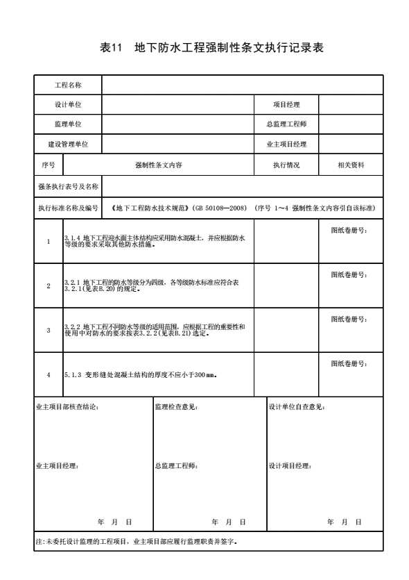 表格名称:表11 地下防水工程强制性条文执行记录表