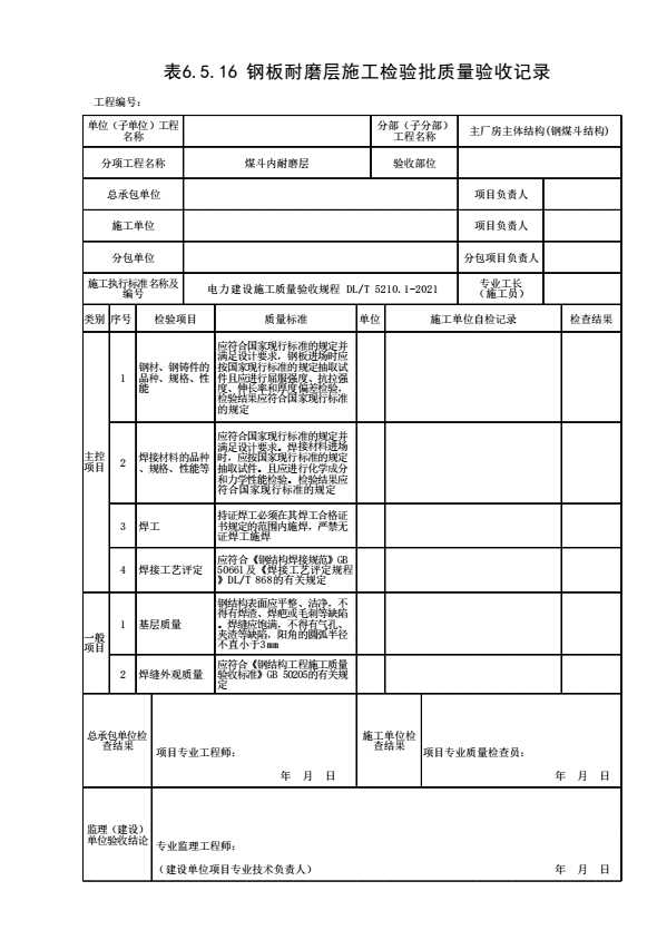 表格名称:表6.5.16钢板耐磨层施工检验批质量验收记录