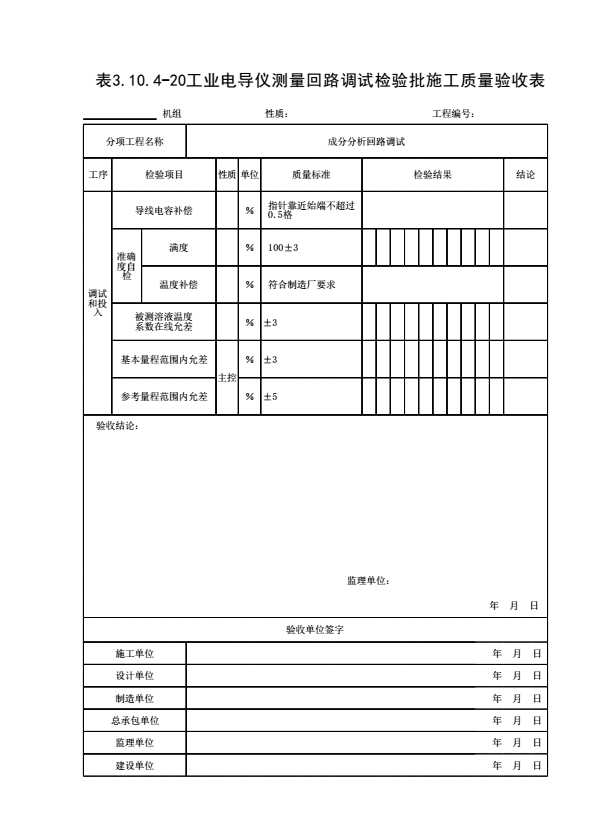 表格名称:表3.10.4-20 工业电导仪测量回路调试检验批施工质量验收表