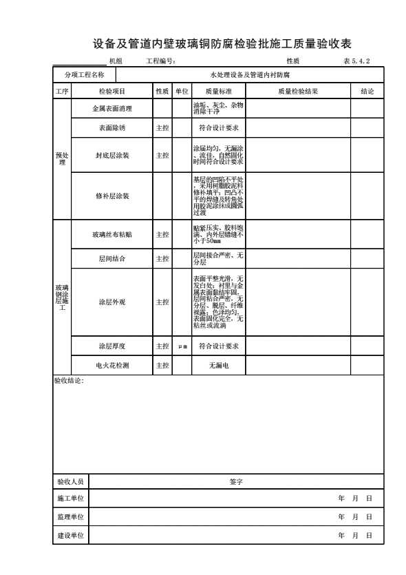 表格名称:表5.4.2 设备及管道内壁玻璃铜防腐检验批施工质量验收表