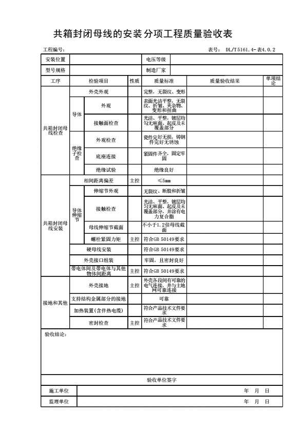 表格名称:表4.0.2 共箱封闭母线的安装分项工程质量验收表