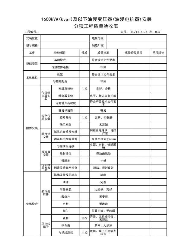 表格名称:表1.0.5 1600kVA(kvar)及以下油浸变压器(油浸电抗器)安装分项工程质量验收表