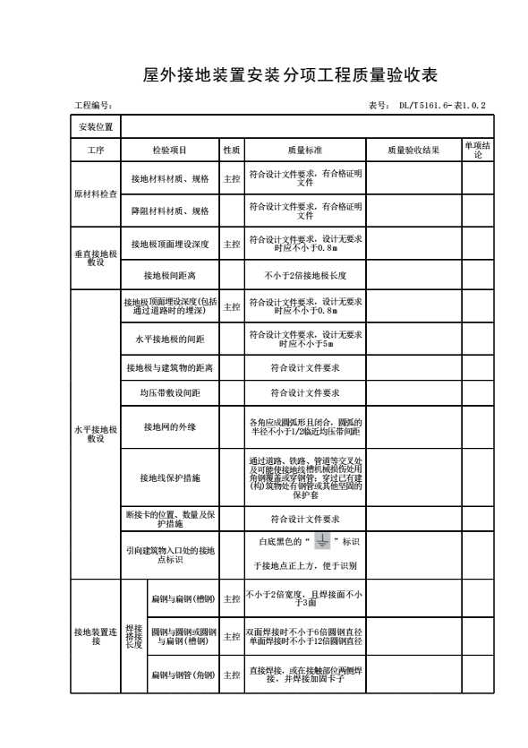 表1.0.2 屋外接地装置安装分项工程质量验收表