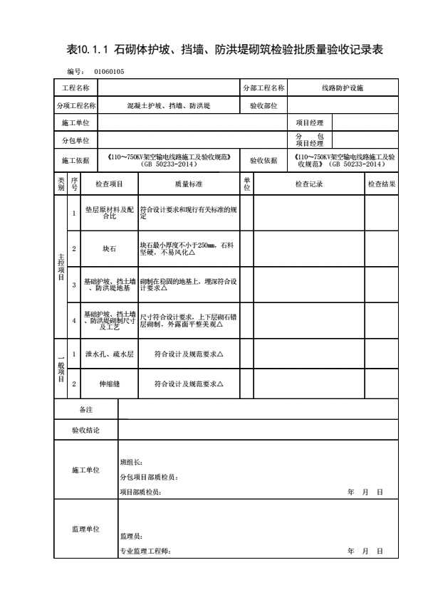 表格名称:表10.1.1 石砌体护坡、挡墙、防洪堤砌筑检验批质量验收记录表