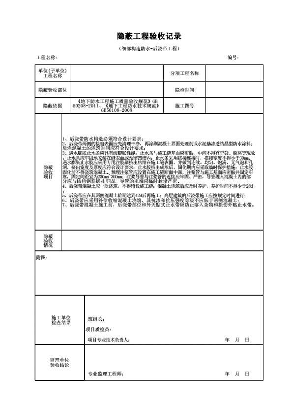 表格名称:隐蔽工程验收记录(细部构造防水-后浇带工程)