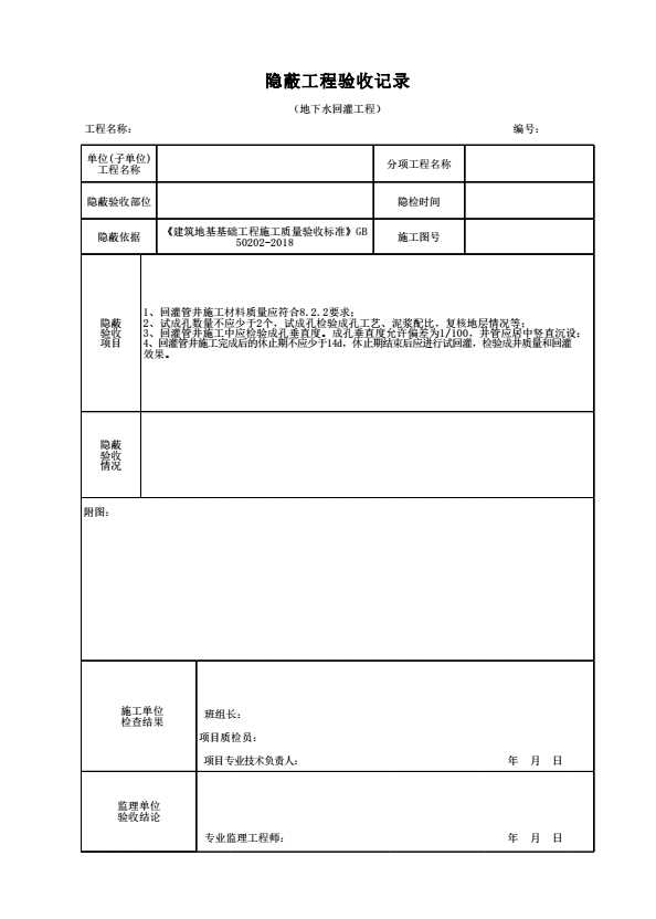 表格名称:隐蔽工程验收记录(地下水回灌工程)