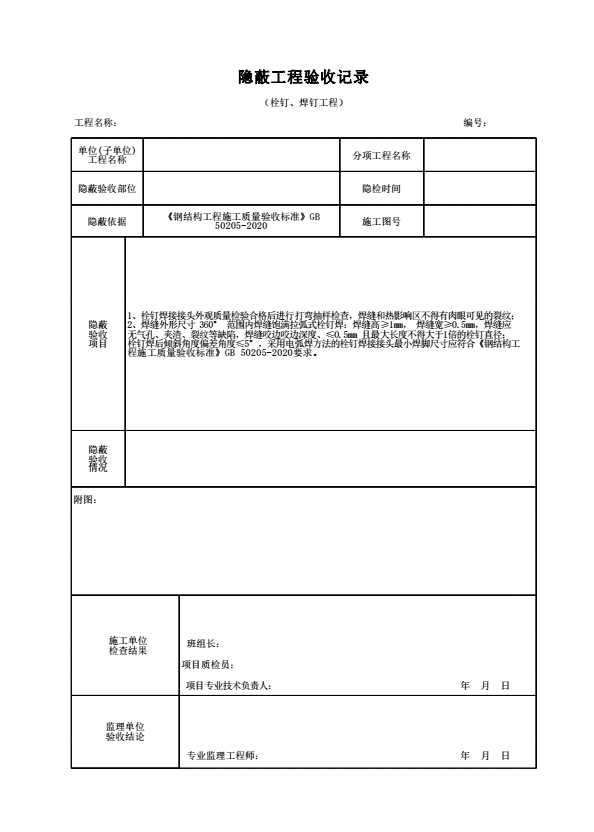 表格名称:隐蔽工程验收记录(栓钉、焊钉工程)