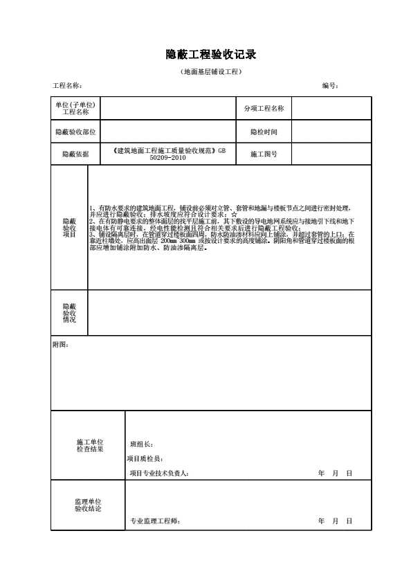表格名称:隐蔽工程验收记录(地面基层铺设工程)