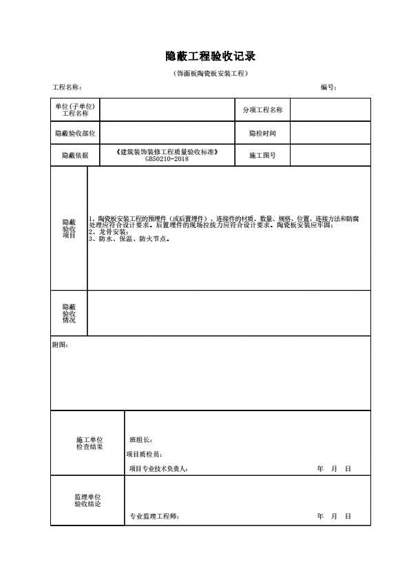 表格名称:隐蔽工程验收记录(饰面板陶瓷板安装工程)