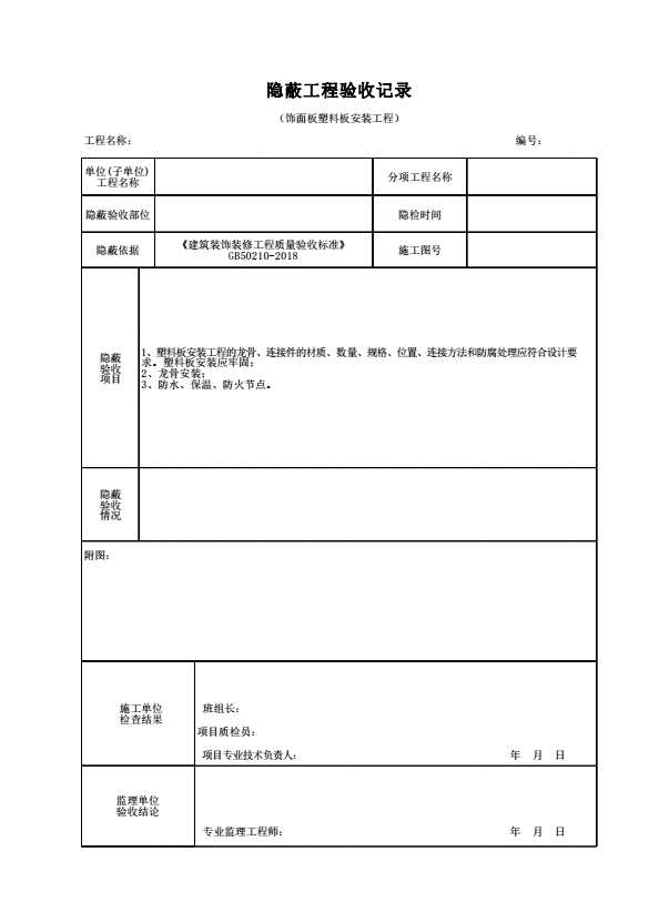 表格名称:隐蔽工程验收记录(饰面板塑料板安装工程)