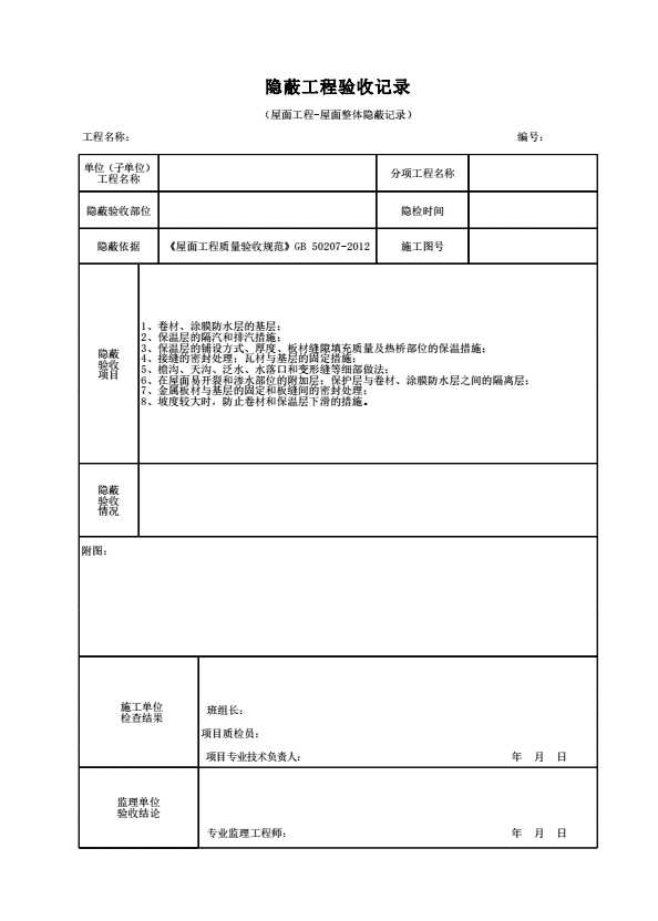 表格名称:隐蔽工程验收记录(屋面工程-屋面整体隐蔽记录)