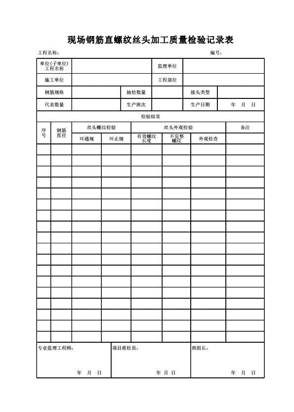 表格名称:现场钢筋直螺纹丝头加工质量检验记录表