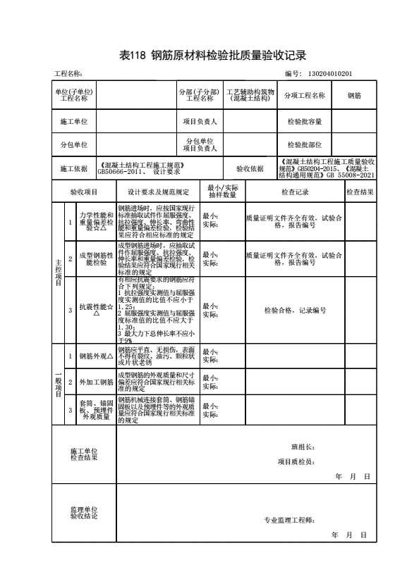 表格名称:130204010201 钢筋原材料检验批质量验收记录