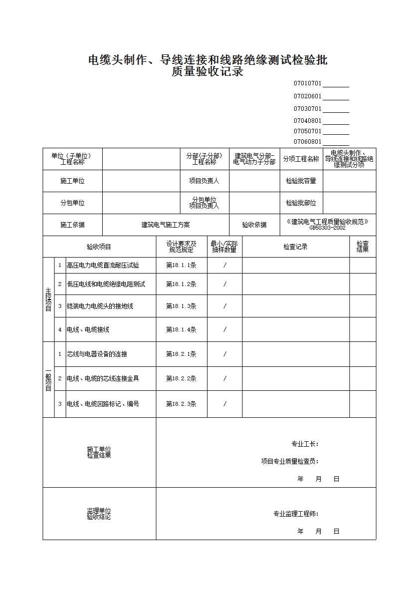 07040801_电缆头制作、导线连接和线路绝缘测试检验批质量验收记录