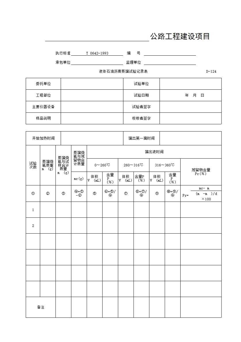 表格名称:D-124 液体石油沥青蒸馏试验记录表